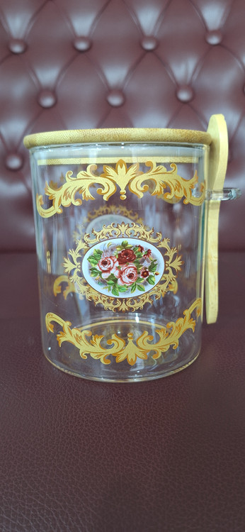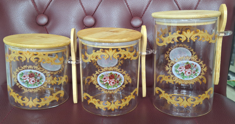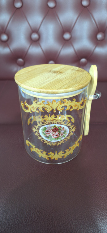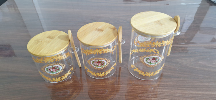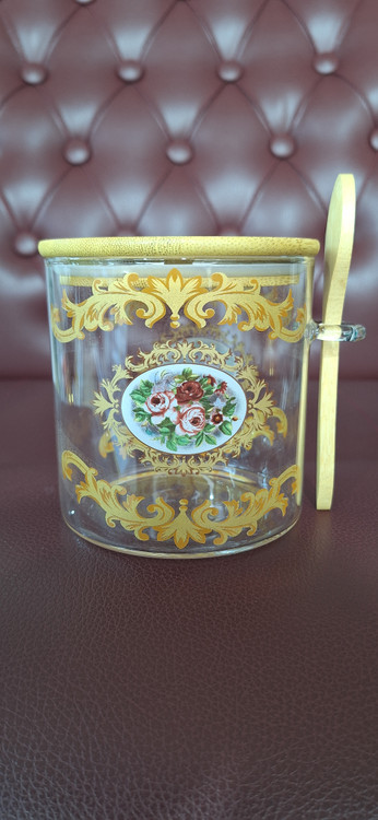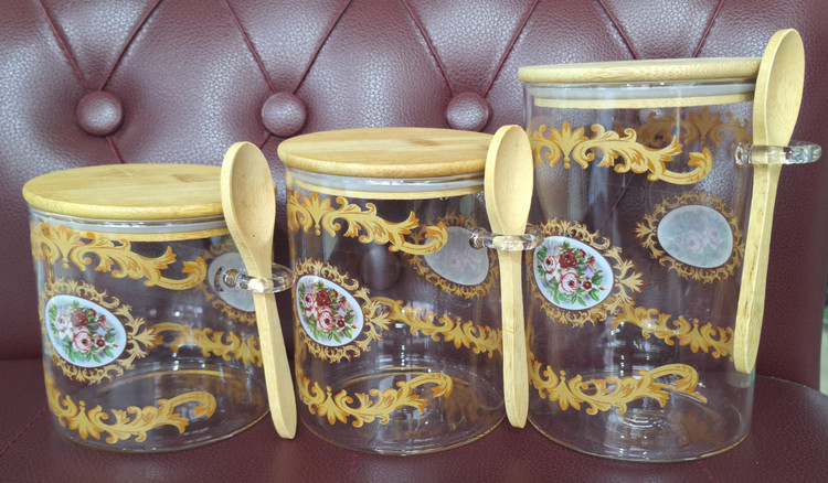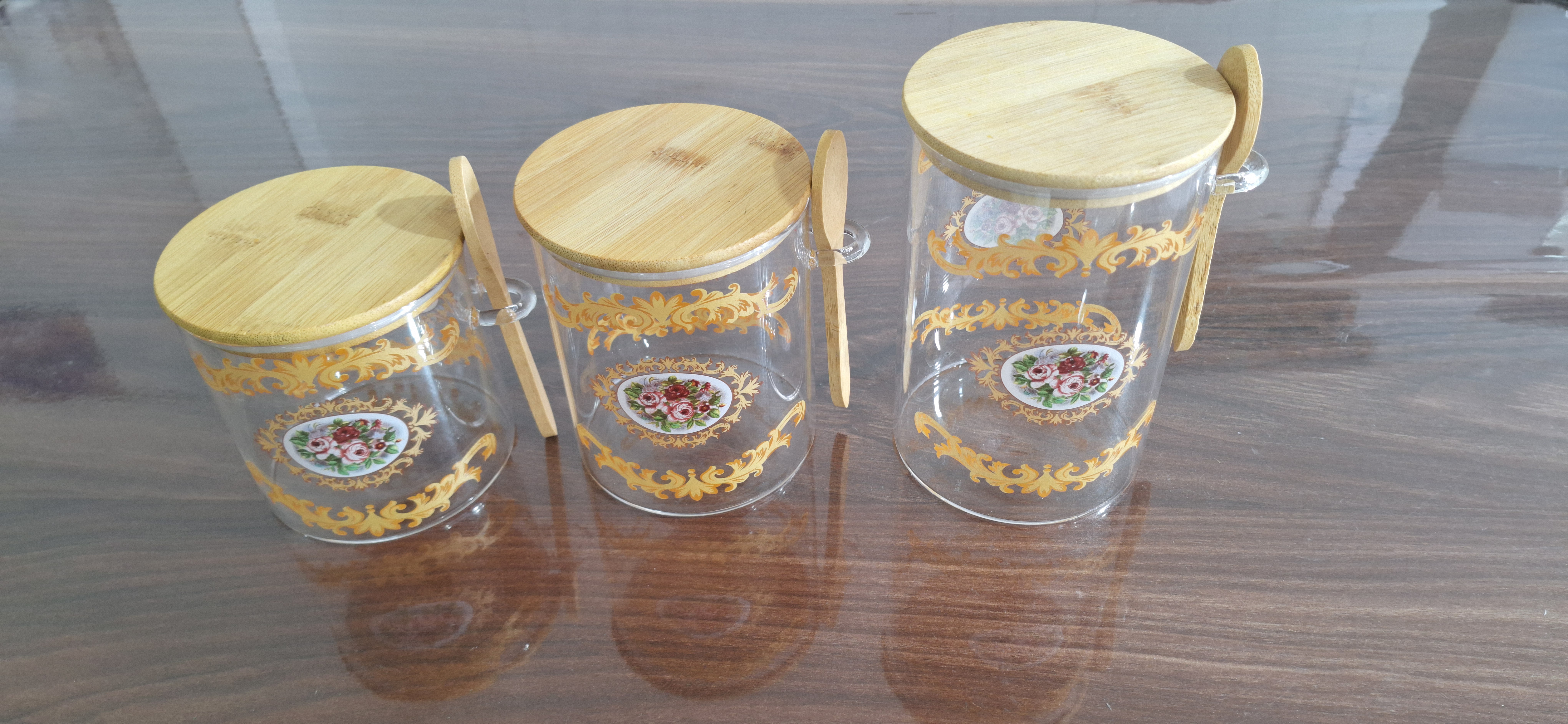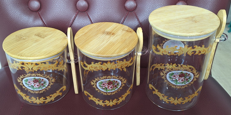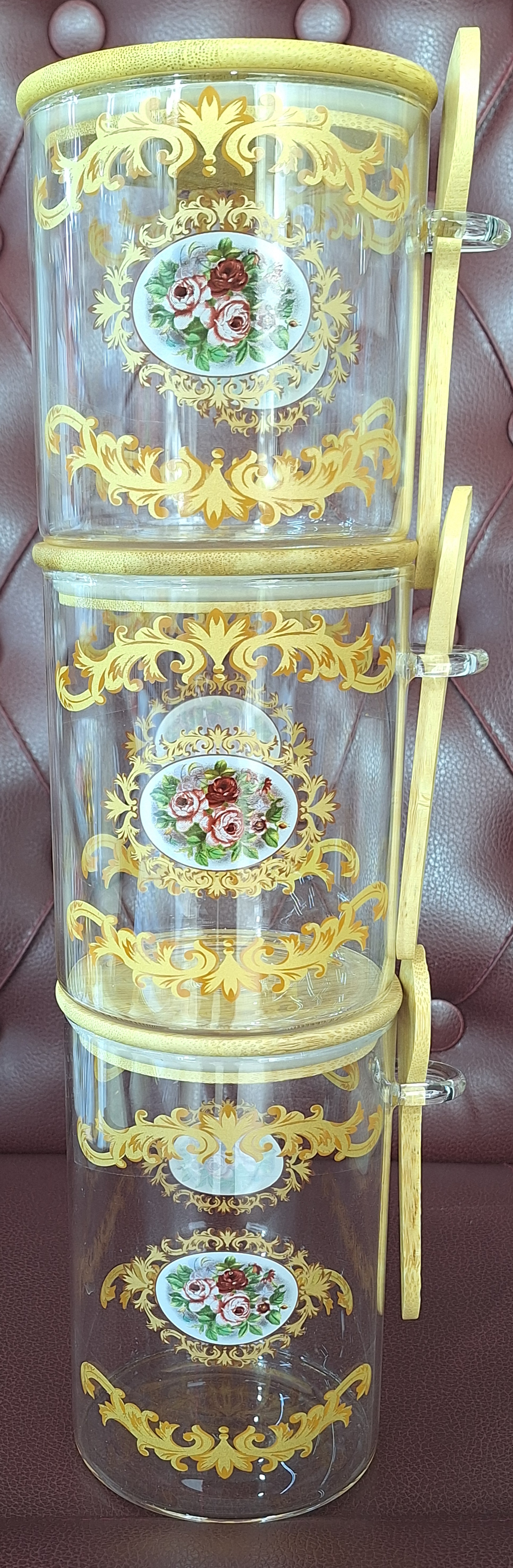 بانکه گرد پیرکس درب بامبو قاشق دار ست 3 تایی وارداتی طرح گل رز l اصل ( شرکتی )